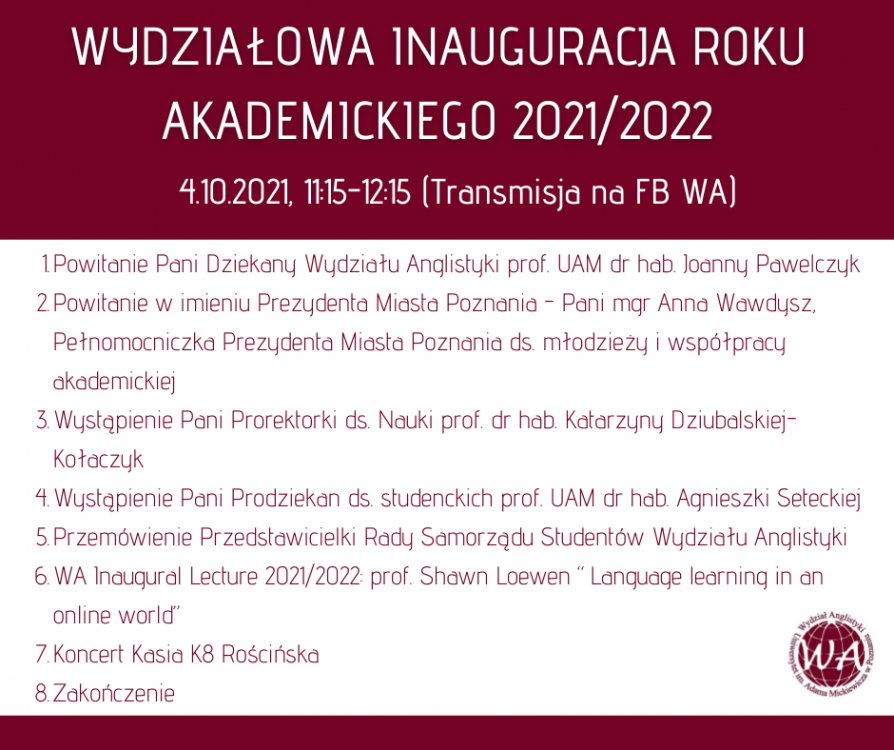 Pani Dziekana Wydziału Anglistyki prof. UAM dr hab. Joanna Pawelczyk zaprasza na wydziałową inaugurację roku akademickiego 2021/2022.