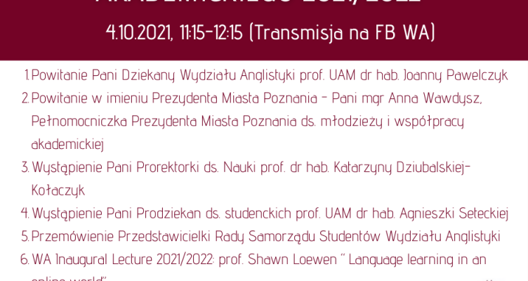 Pani Dziekana Wydziału Anglistyki prof. UAM dr hab. Joanna Pawelczyk zaprasza na wydziałową inaugurację roku akademickiego 2021/2022.